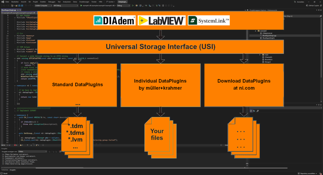 Während DataPlugIns zum Lesen einfacher Datenformate mit Hilfe von Assistenten erstellt werden können, müssen diese für komplexe Datenstrukturen oder wenn Fremdformate nicht nur gelesen, sondern auch gespeichert werden sollen, durch spezielle Programmierung in C++ erstellt werden. Das übersteigt Ihre Kapazitäten? Dann können wir helfen. Beispiel gefällig? Unser 64-Bit-DataPlugIn für das RPC-III-Format erlaubt es, Dateien für Steuerung von Dauerlaufprüfständen zu laden und zu speichern. Es verarbeitet dabei konform zum NI-TDM-Datenmodell sowohl Headerinformationen wie Kanalnamen und Einheiten als auch die Binärdaten, egal wie viele Kanäle in der Datei enthalten sind.