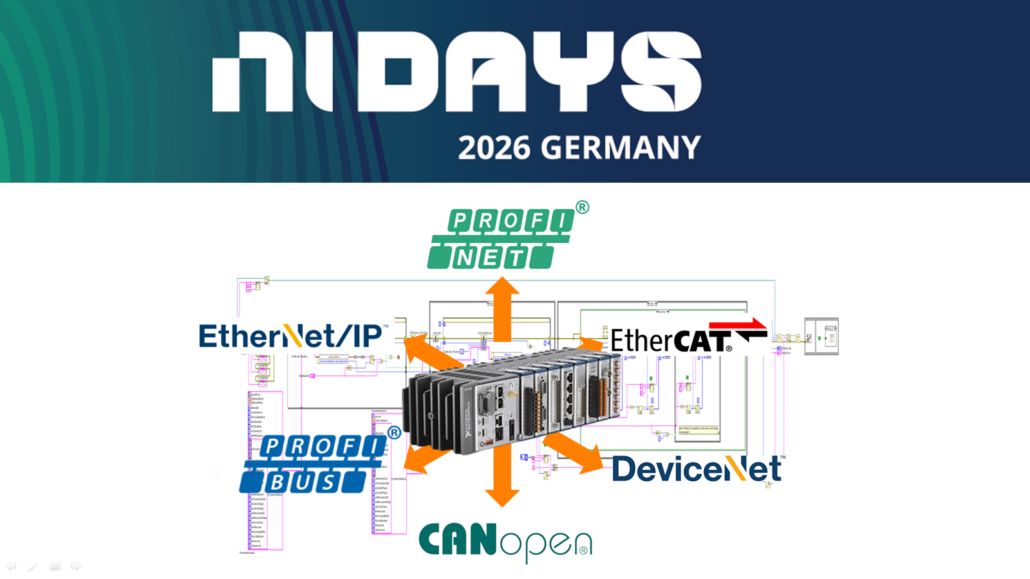 Unter diesem Titel stand der Vortrag, den Manuel Hofmann von NI und ich auf den NI Days 2026 in München gehalten haben. Manuel hat dabei die grundsätzlichen Anforderungen an moderne Prüflösungen beschrieben und aufgezeigt, wie diese mit dem umfassenden NI Ecosystem aus Hard- und Software erfüllt werden können. Im Anschluß habe ich am Beispiel unserer end-of-line-Prüfstände bei Emerson Aventics dargestellt, wie wir bei müller+krahmer speziell die Skalierbarkeit unserer Systeme sicherstellen: durch eine konsequent feldbusbasierte Auslegung.